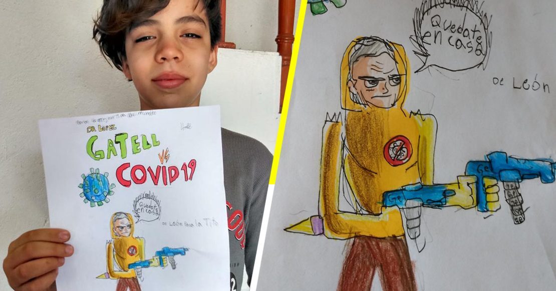 - Este sábado y domingo las niñas y niños podrán enviar un dibujo a López-Gatell a través de videos de 30 segs, se escogerán los 20 mejores videos y para hacerlas en vivo, mismas que él presentará el jueves 30 de abril (imagen infra izquierda), día que será dedicado a ellos en la conferencia de las 7:00 p.m. y estarán en vivo mediante video conferencia (ve los detalles en el video de abajo). Por tanto, ese día no habrá presentación del comunicado técnico sino que se subirá a la página para que lo podamos accesar. Probablemente, esta iniciativa esta inspirada en la noticia de estos días sobre que un niño hizo un dibujo de López-Gatell pues lo admirá mucho (imagen infra derecha). Puedes ver esa noticia en el artículo “LO ADMIRO MUCHO”: UN NIÑO DE 9 AÑOS NOS HABLA SOBRE SU DIBUJO DE HUGO LÓPEZ-GATELL CONTRA EL CORONAVIRUS, publicada por Stephania Carmona el 23 de abril de 2020 en Sopitas.com.